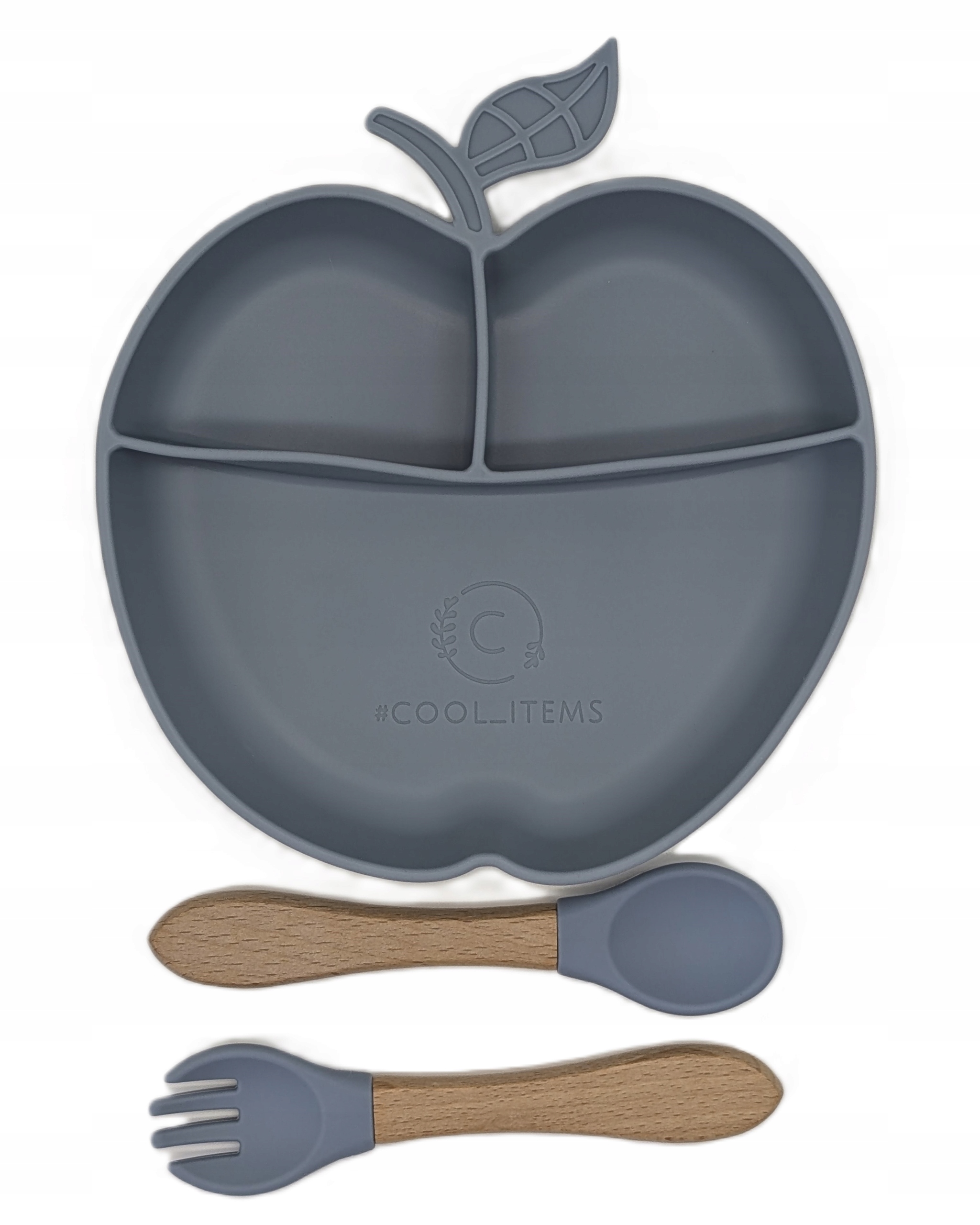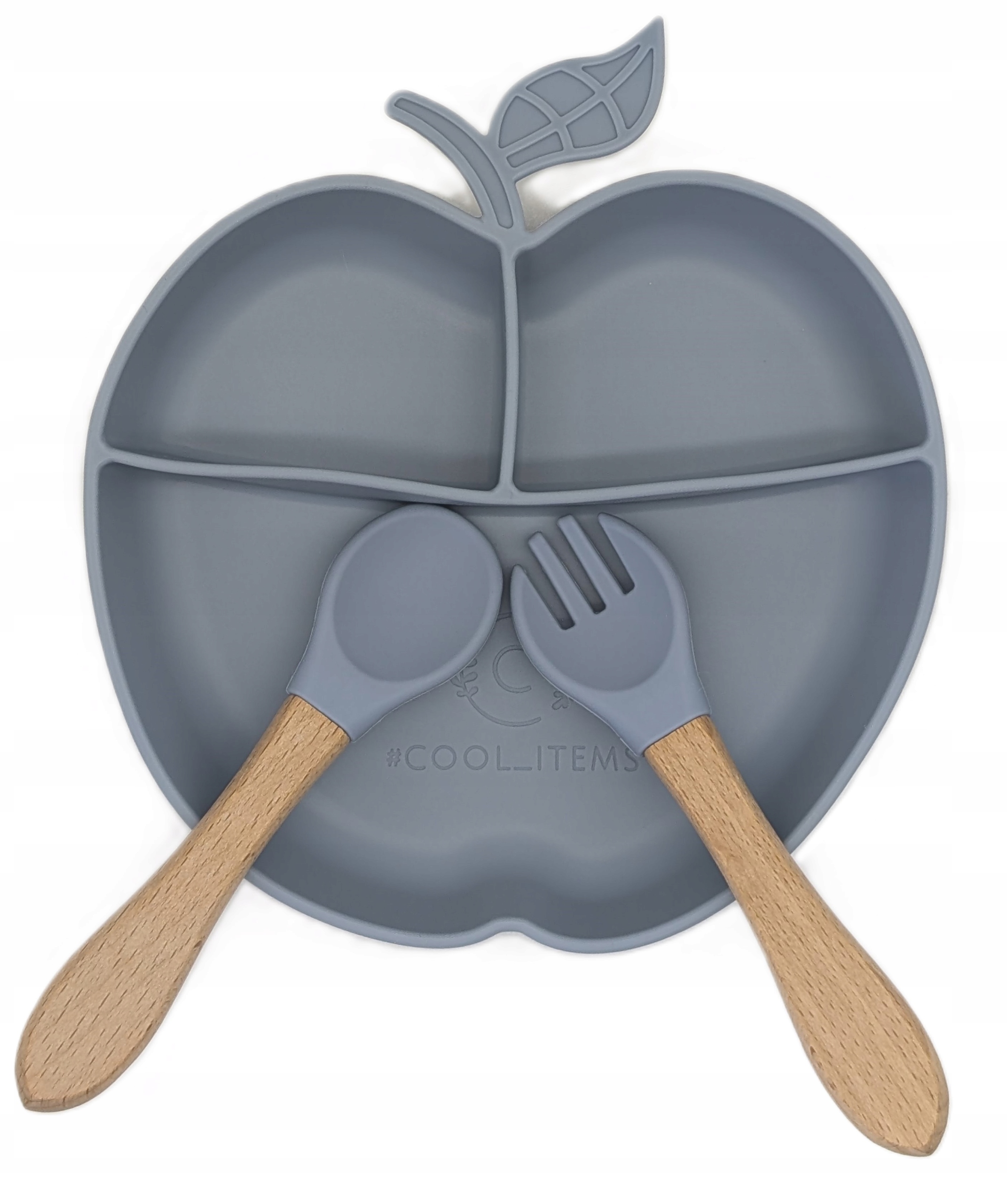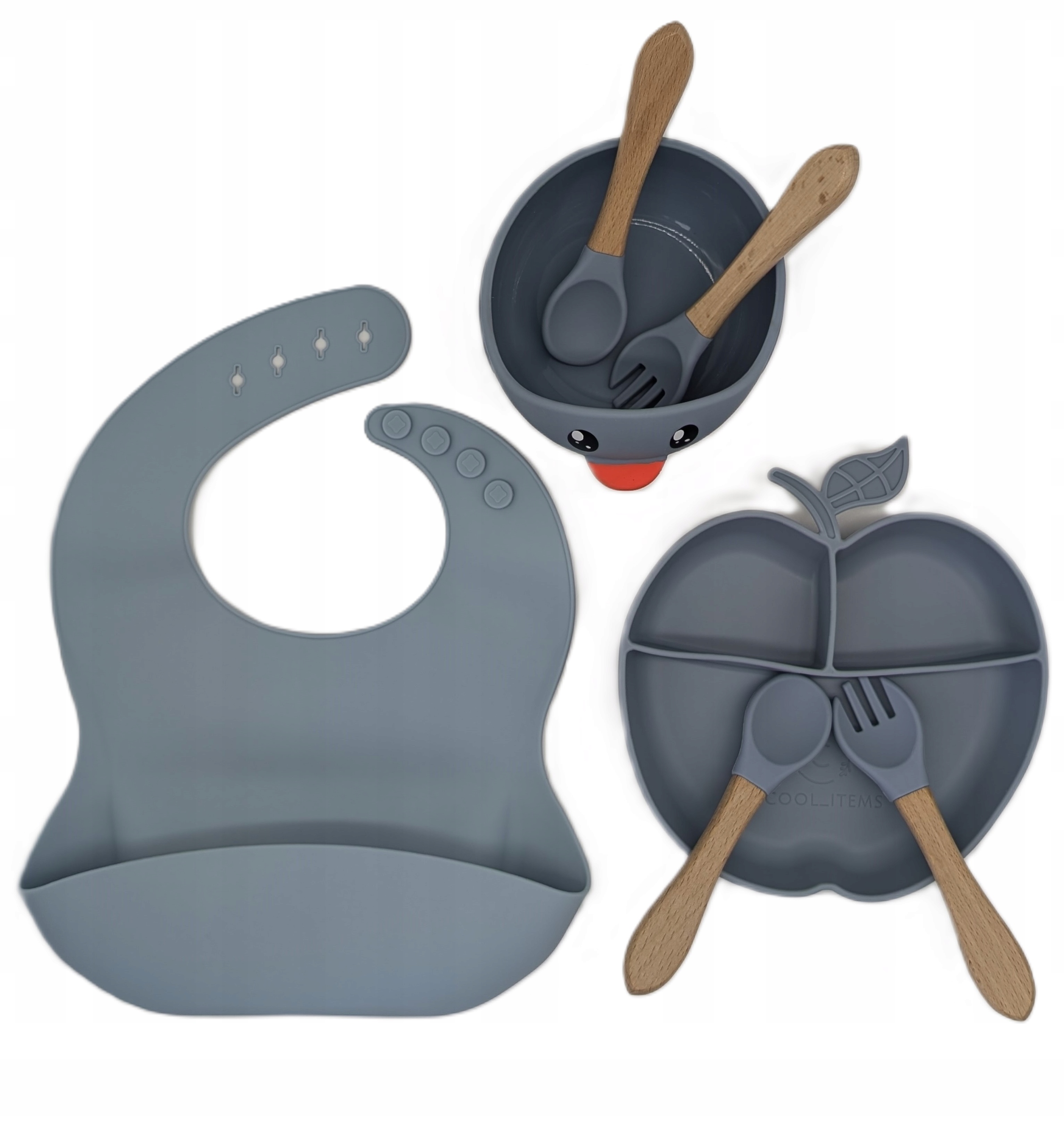 - Talerz silikonowy + widelec bambusowy z końcówką silikonową + łyżeczka bambusowa z końcówką silikonową