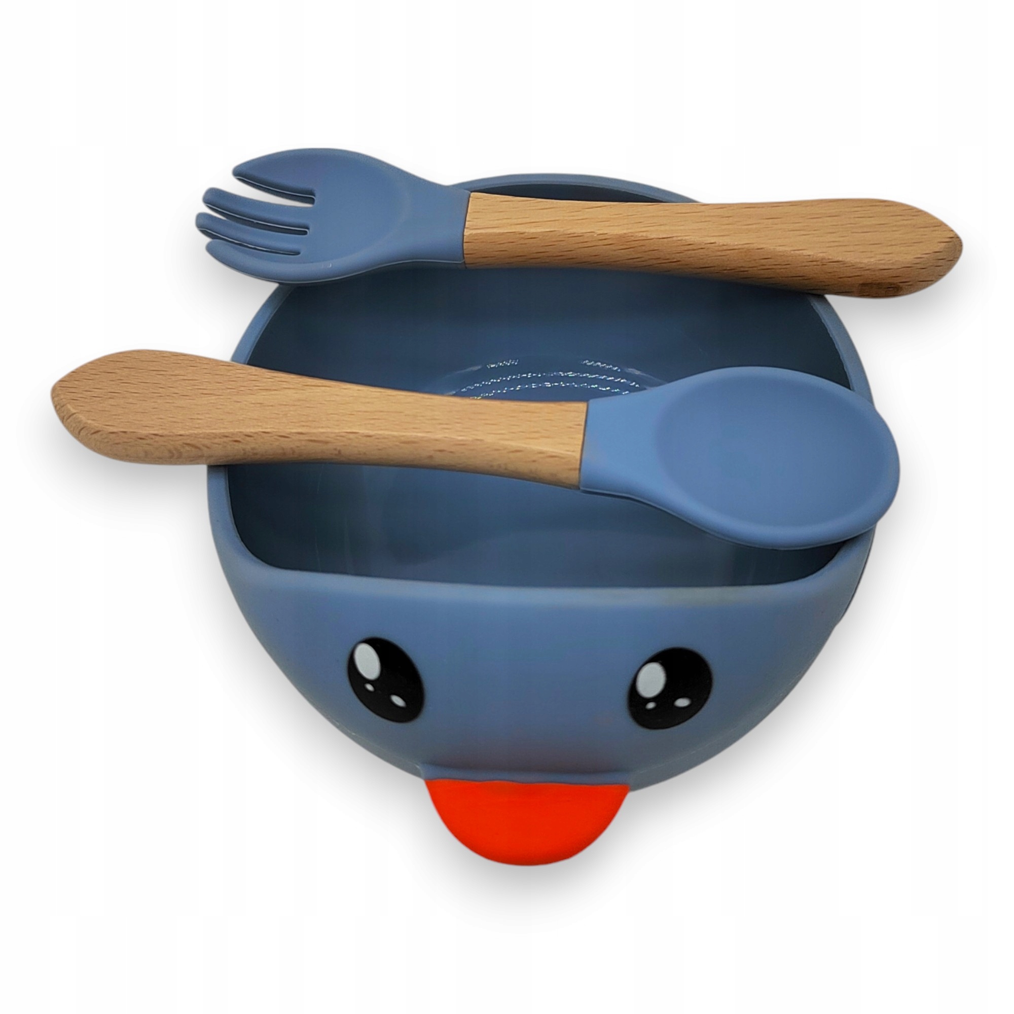 - Miseczka silikonowa + widelec bambusowy z końcówką silikonową + łyżeczka bambusowa z końcówką silikonową
